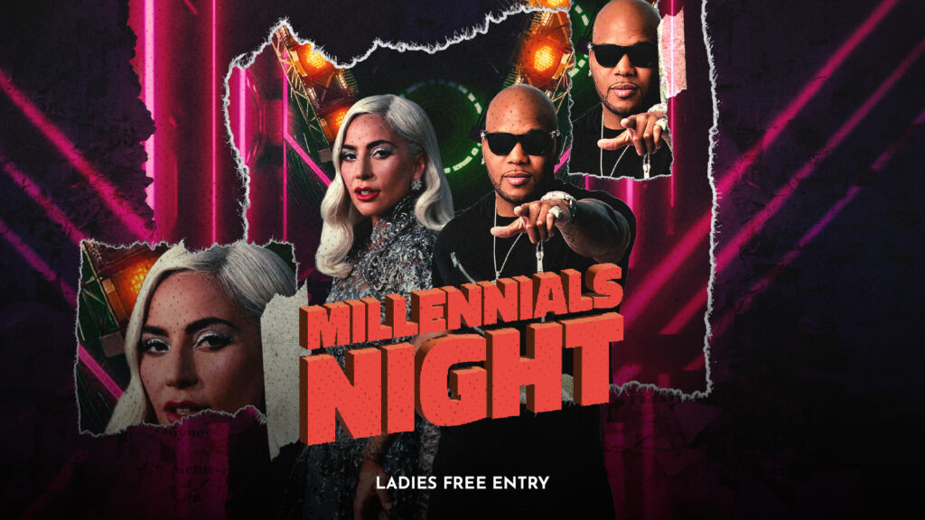 Hudba a hity, na ktorej si vyrastal ty, tvoji kamoši a takisto samozrejme aj my a my ti prinášame pravidelnú a obľúbenú noc, počas ktorej si tieto hity vypočuješ. Od Davida Guettu, Rihannu, 50 centa a tak ďalej. Nezameniteľná noc s názvom Millennials.